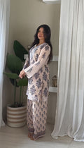 Design: Features a classic all-over floral block print in a sophisticated deep blue/grey hue against a soft, neutral base.