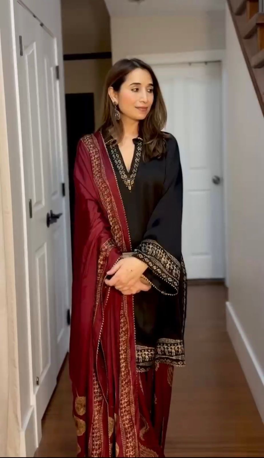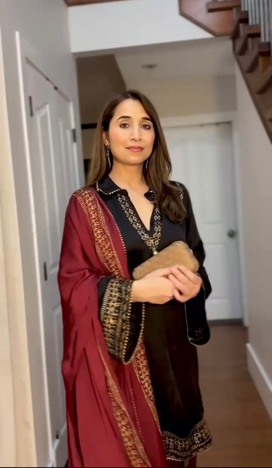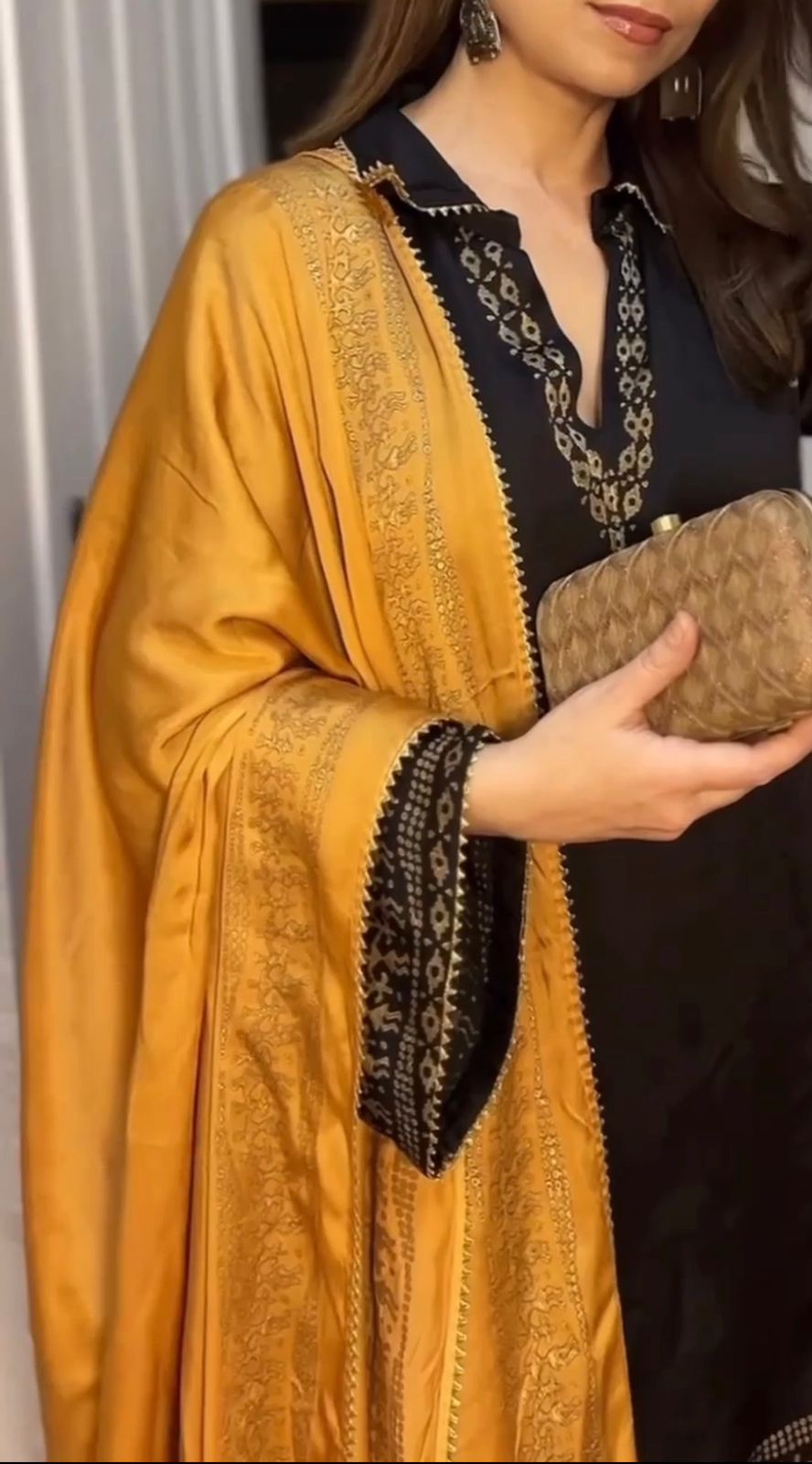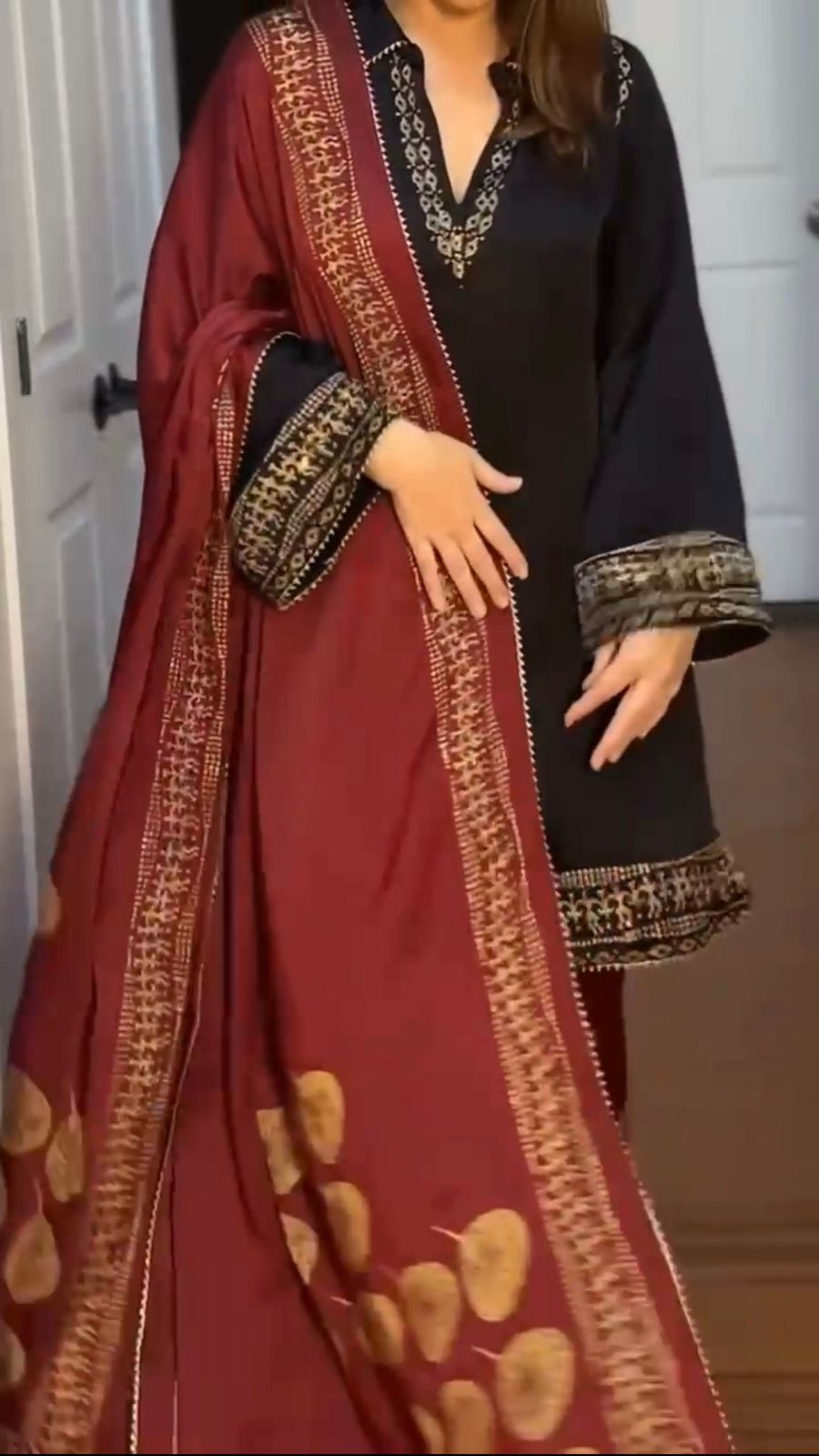 Two stunning shades, one timeless elegance +t A classic black kurta beautifully paired with rich maroon and mustard dupatta options, adorned with intricate detailing for a graceful and versatile look.
