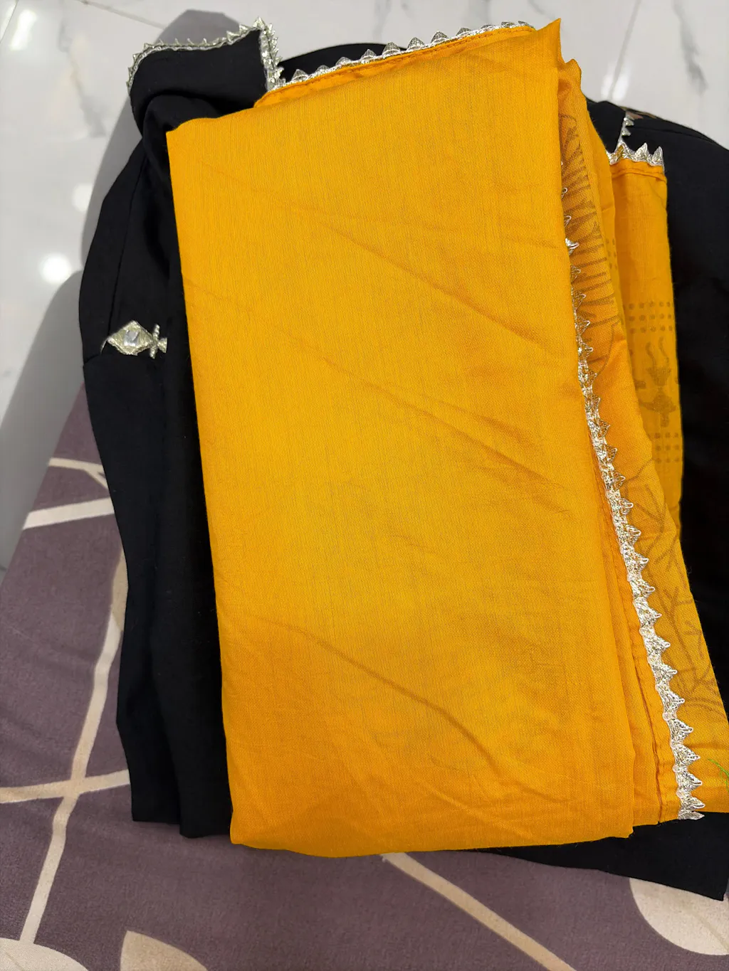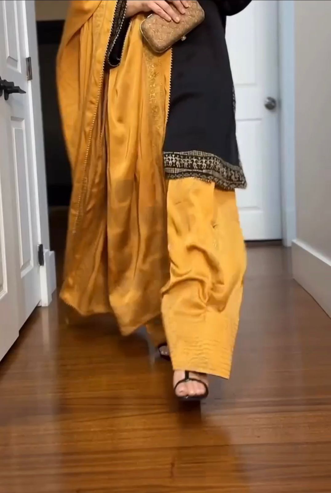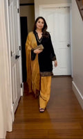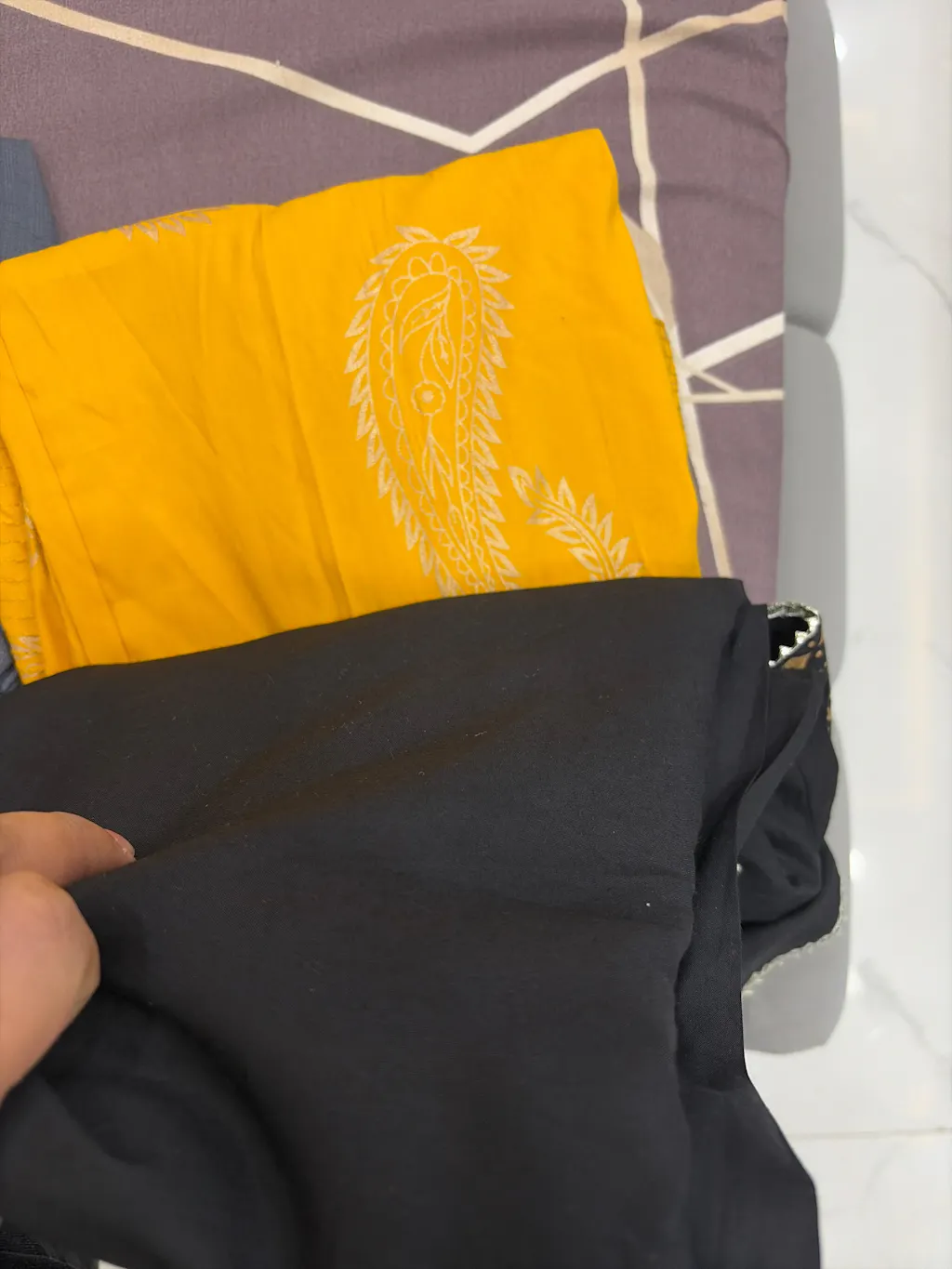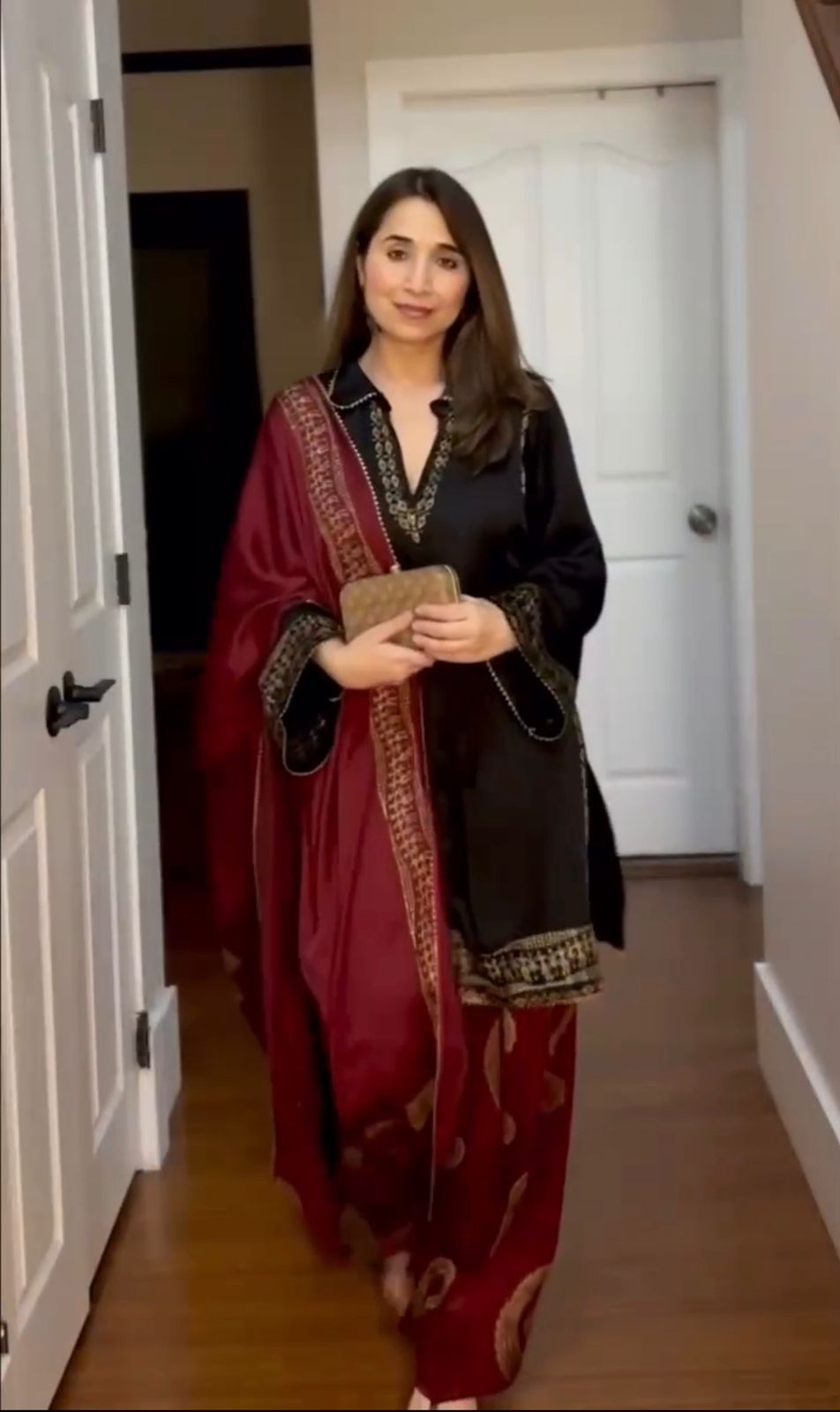 Two stunning shades, one timeless elegance +t A classic black kurta beautifully paired with rich maroon and mustard dupatta options, adorned with intricate detailing for a graceful and versatile look.